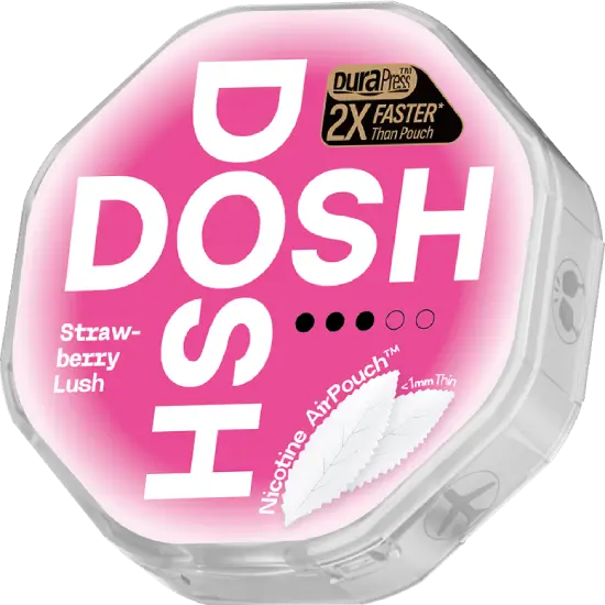 DOSH Strawberry Lush 9 mg Ultra-dünner, tabakfreier Snus mit süßem Erdbeergeschmack. 9mg Nikotin, stark und ausgewogen.